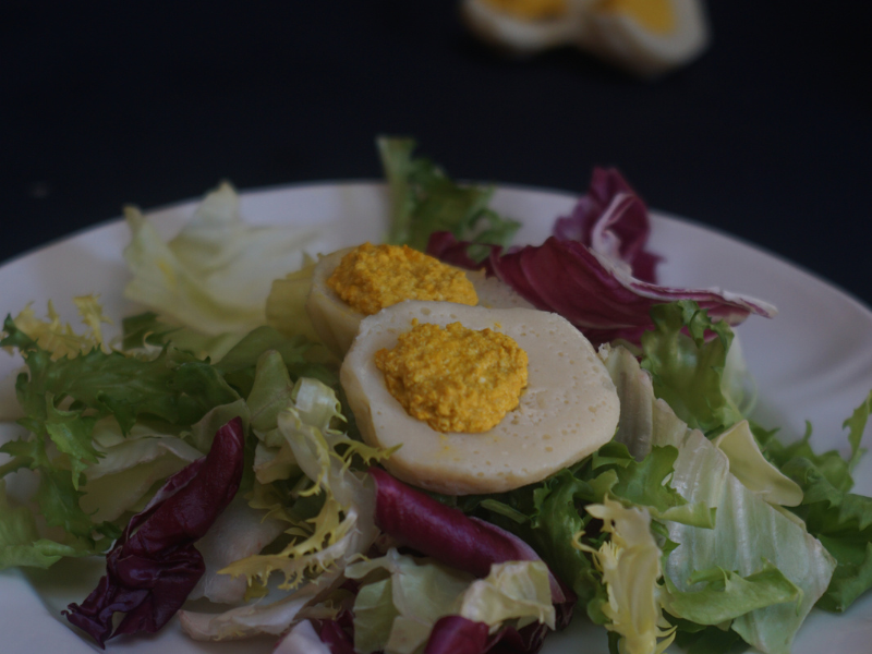 - Inserisci nelle cavità ricavata la crema, cercando di ottenere una piccola pallina che imiterà il tuorlo. In questo modo, otterremo un simil-uovo bollito da poter utilizzare nelle nostre insalate e decorazioni alimentari.