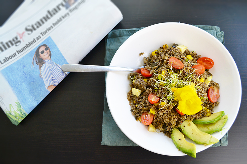 Quelle di oggi sono due ricette perfette in ogni occasione, ma soprattutto per i pranzi fuori casa e da gustare in ufficio, perché sono facilmente trasportabili e mantengono la loro freschezza e, infatti, le preparo spesso in questo periodo perché mi muovo continuamente dall’Hertfordshire a Londra. La prima è un’insalata messicana a base di quinoa e la seconda è un’insalata con crema di pomodori secchi e preparata con il farro: due piatti ricchi di proteine, fibre e Sali minerali, necessari per mantenere una dieta equilibrata senza rinunciare al gusto.