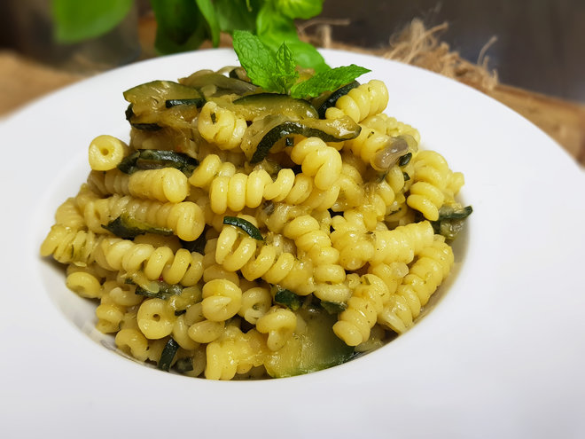 - Scolate la pasta quando sarà pronta, conditela con la crema che avete ottenuto precedentemente dalle zucchine e aggiungete sulla superficie la metà non frullata per dare una consistenza più croccante al piatto.