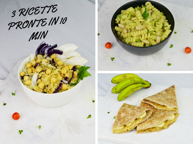 Oggi, ve ne propongo tre che si possono realizzare in pochi minuti e sono perfette per un pranzo a sacco: cous cous di farro con verdure di stagione, fusilli con salsa di avocado e piadina di farro con burro di arachidi.