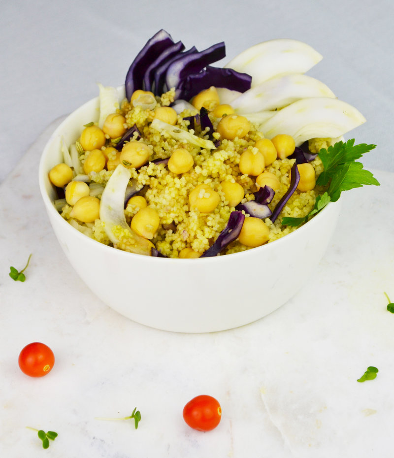 - Nella ciotola del cous cous unisci il finocchio, la verza, il porro, i semi di finocchio, i ceci, l’aceto balsamico, un filo di olio e sale a piacere.