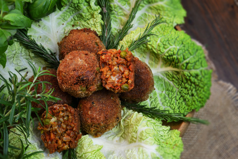 Questa versione vegan degli arancini è formata da palle di farro condite con ragù di lenticchie, avvolte in una sottile pastella croccante e con un morbido cuore di mozzarella di riso. Godetevi la tradizione, mista alla creatività!