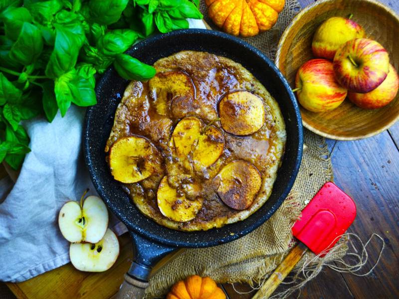 Oggi, per esempio, ho iniziato la giornata con questi due ingredienti, preparando un tortino: un impasto delicato e senza zucchero, soffice all’esterno e con un croccante cuore di mela, cotto in padella e insaporito con la giusta dose di cannella. Una ricetta facile e veloce, in cui ho sostituito le uova con farina di semi di lino e acqua, una soluzione preparata in casa, in pochissimi passaggi e perfetta per i dolci.