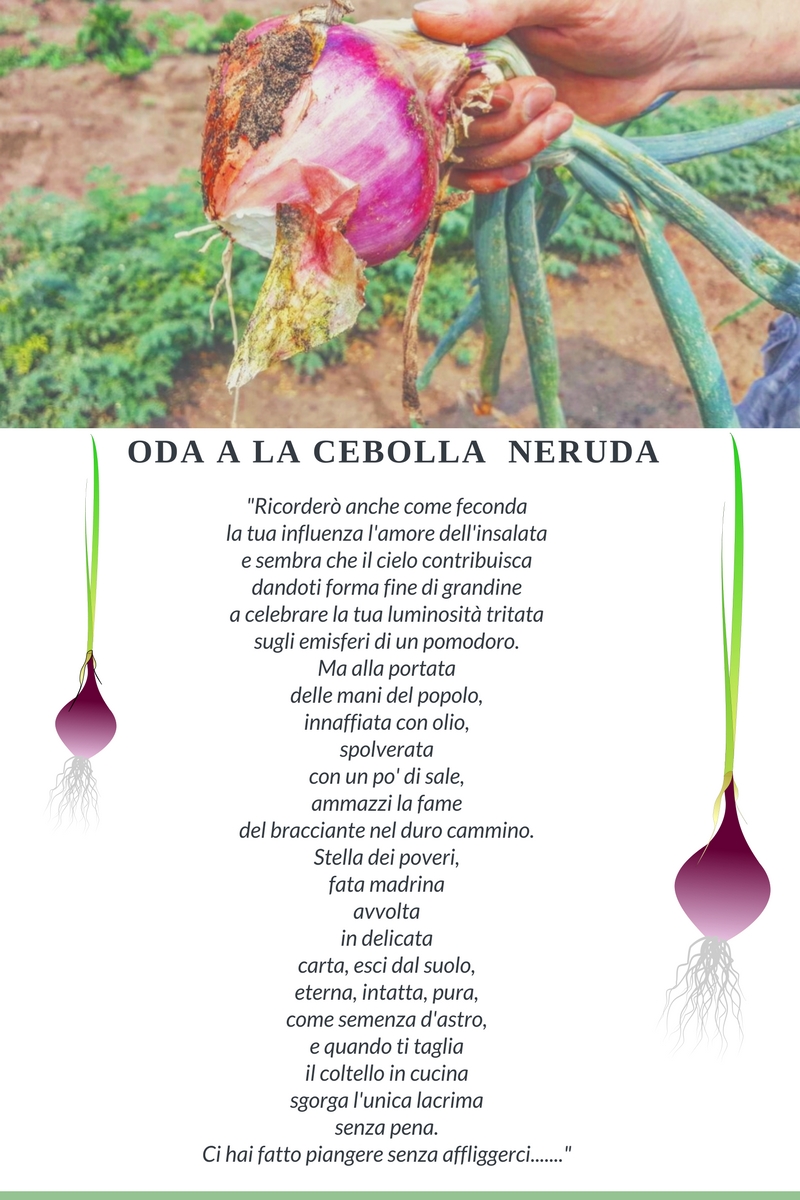 “…luminosa ampolla, petalo su petalo s’è formata la tua bellezza, squame di cristallo t’hanno accresciuta e nel segreto della terra buia s’è arrotondato il tuo ventre di rugiada”, scrive Neruda in una meravigliosa Ode dedicata alla cipolla.