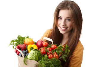 woman holding a bag full of healthy food. shopping .