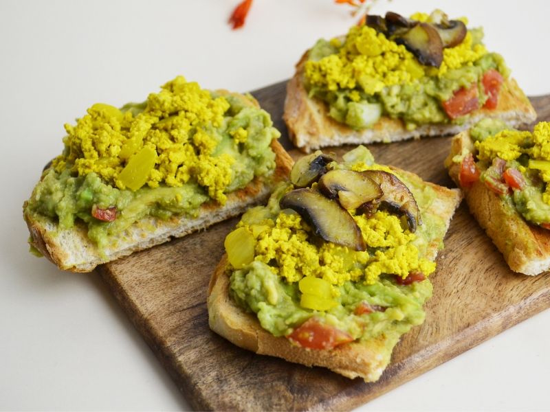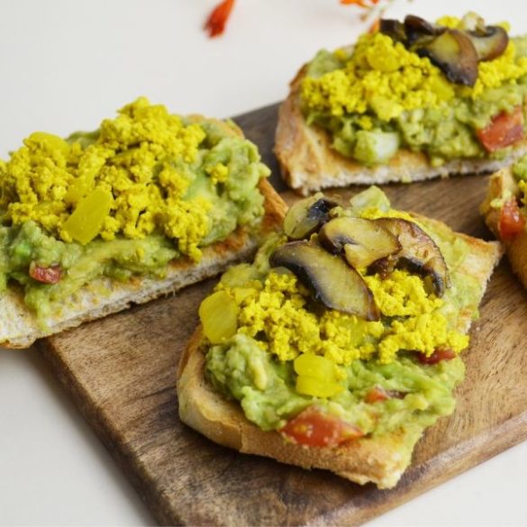 Queste croccanti fette di pane tostato, farcite con fresco guacamole, simil uova strapazzate e saporiti funghi sono un mix di sapori e consistenze irresistibili, che in pochi minuti possono regalarci la felicità!