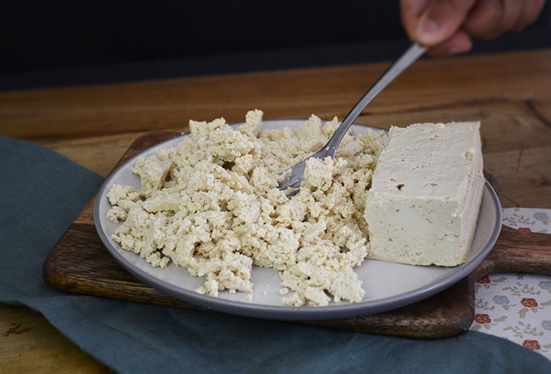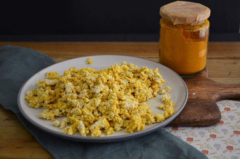 - Asciuga il tofu con l’aiuto di un panno pulito, ponilo in un contenitore e schiaccialo con una forchetta, in modo tale da sbriciolarlo e insaporiscilo con un filo di olio, pepe, curcuma e sale a piacere.