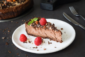 Chocolate cheesecake with raspberries, nuts and mint leaf on white plate.