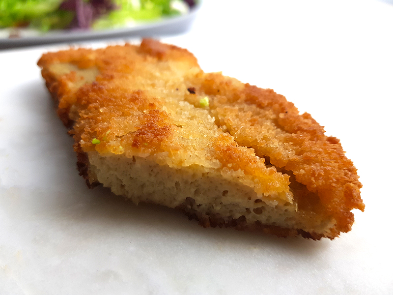 - Taglia il seitan a fette di circa 1 cm di spessore e immergile nella pastella, poi ricoprile uniformemente con il pangrattato.