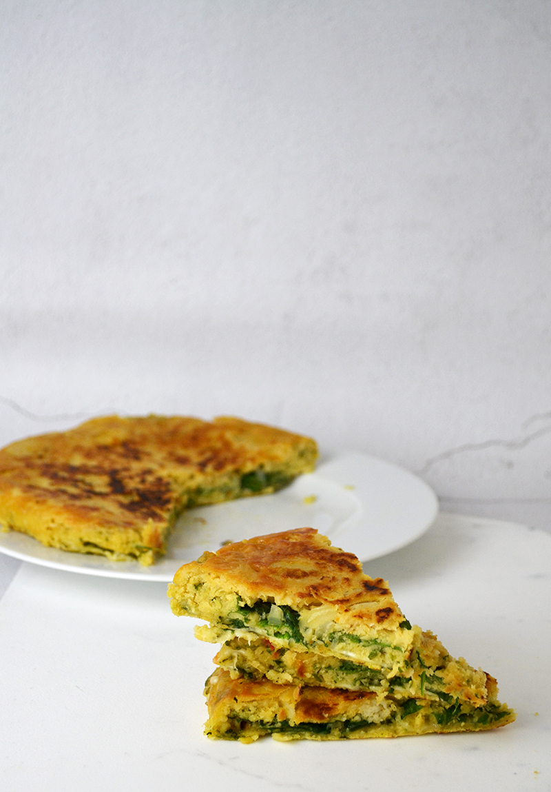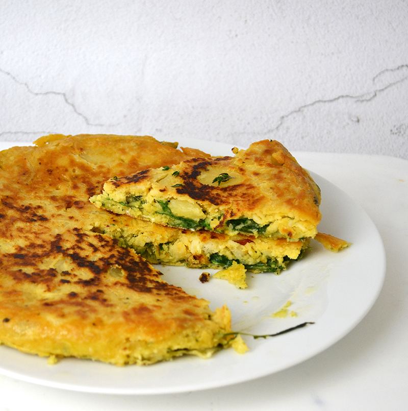 - Lascia cuocere a fiamma bassa e con coperchio, per circa 8-9 minuti, controlla che la base sia dorata e la parte superiore semi-solida e girala con l’aiuto di un piatto. Fai cuocere l’altro lato per 8-9 minuti e, infine, servi.