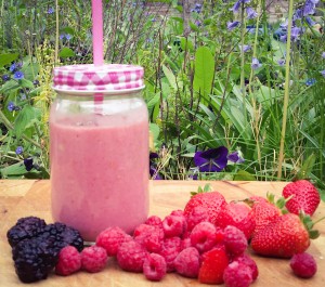 Frullato #vegano con latte di mandorle, lamponi, more, fragole e banana 🙂