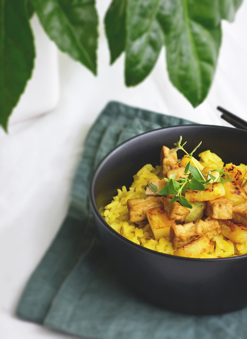 Il tofu è un prodotto fermentato ottenuto dai fagioli gialli della soia, ricco di vitamine e sali minerali in particolare di calcio che aiuta a prevenire l’osteoporosi. L’ananas è un frutto dalle molteplici proprietà quali digestive e antinfiammatorie grazie all’enzima bromelina e proprietà diuretiche che favoriscono la riduzione della ritenzione idrica.