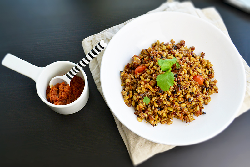 Il farro è un ottima alterativa al riso sia per la preparazione di piatti freddi che caldi, ricco di vitamine, sali minerali e fibre, consiglio il decorticato a chi non è abituato al consumo di troppe fibre. Le lenticchie rosse, fonte di ferro, molto digeribili anche da chi soffre di problemi intestinali in quanto prive della cuticola esterna la quale è maggiormente ricca di fibre. I pomodori secchi sono un’ottima fonte di licopene, un’antiossidante che previene la funzionalita prostatica.