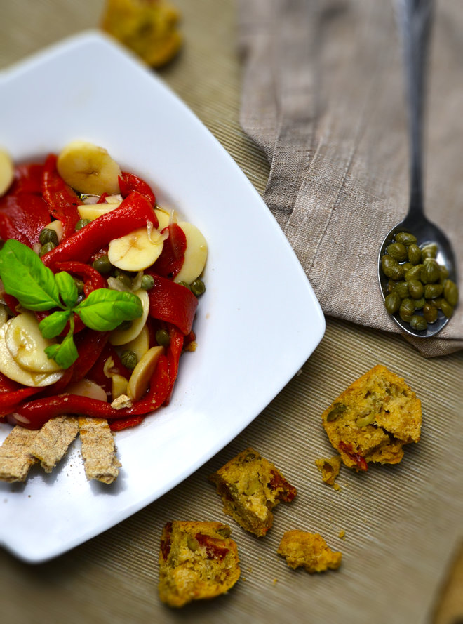 - Mischiate in una ciotola i peperoni con le patate e aggiungete l’aglio, la cipolla, l’olio, i capperi, l’aceto e sale a piacere.