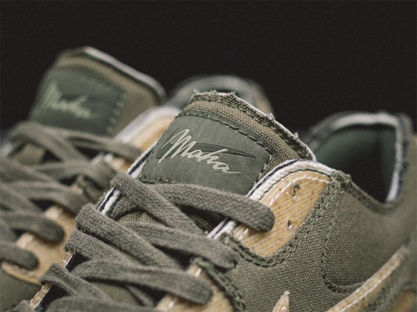 Lo stile di queste scarpe, modello Air Max 90, si presenta come un mix delle caratteristiche dei due marchi in collaborazione. L’unico colore disponibile è il “maha Olive”, una tonalità di verde utilizzata dal marchio Maharishi e ottenuta da melograno e curcuma.