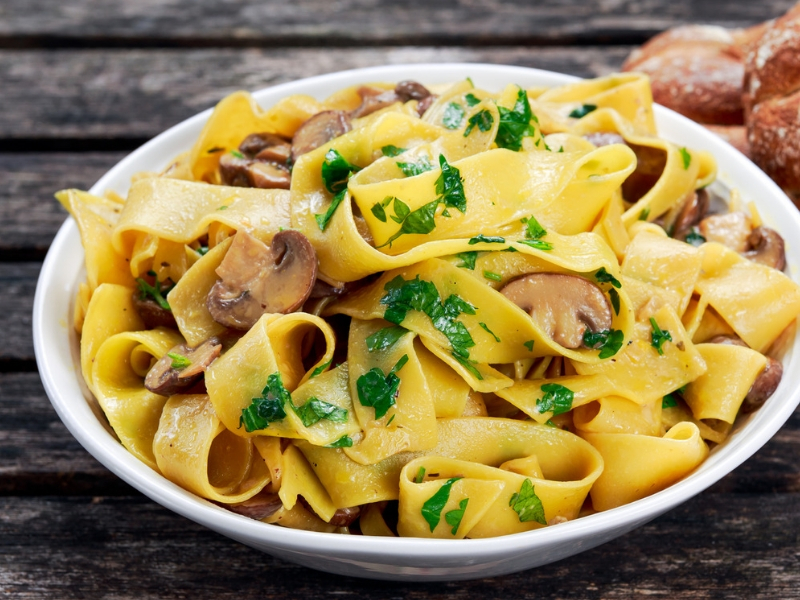Pappardelle con panna, funghi. e piselli (Clicca qui per la ricetta)