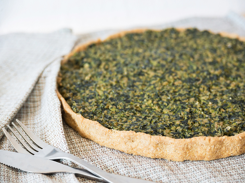 Homemade shortcrust pastry quiche with tofu and spinach