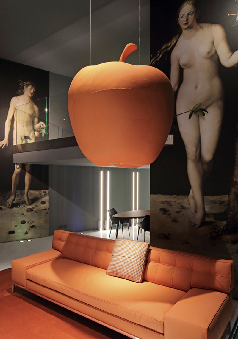 La collezione attualmente visibile a Parigi è una vera esposizione artistica, in cui i pezzi in mostra sono legati a tre riferimenti che hanno la mela come protagonista: il primo è quello di Adamo ed Eva, costituito dalle riproduzioni dei dipinti di Albrecht Durer; il secondo è la teoria della gravità di Newton, che è nata proprio dalla caduta di questo frutto dal ramo di un albero, ed è caratterizzato da enormi mele sospese in aria e ricoperte dello stesso tessuto che ricopre i mobili; il terzo è il ritratto di Magritte, in cui c’è un uomo con una mela sospesa davanti al viso e che nell’esposizione è stato riprodotto sulle pareti.