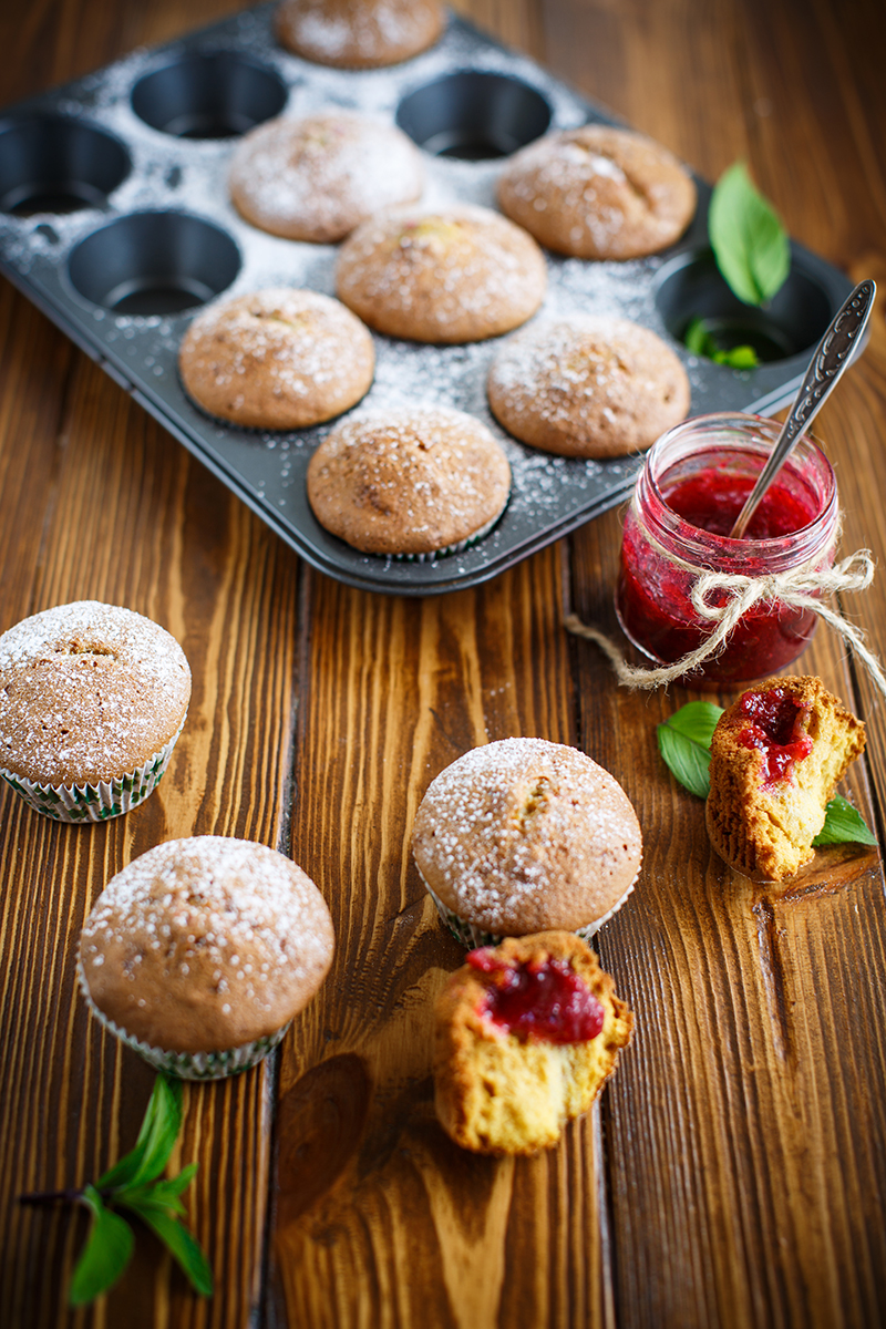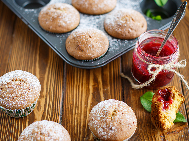 Aggiungi la marmellata all’impasto nel pirottini, prima di infornarli, se desideri avere una farcitura interna.