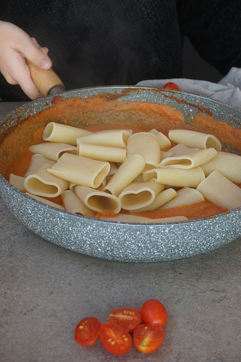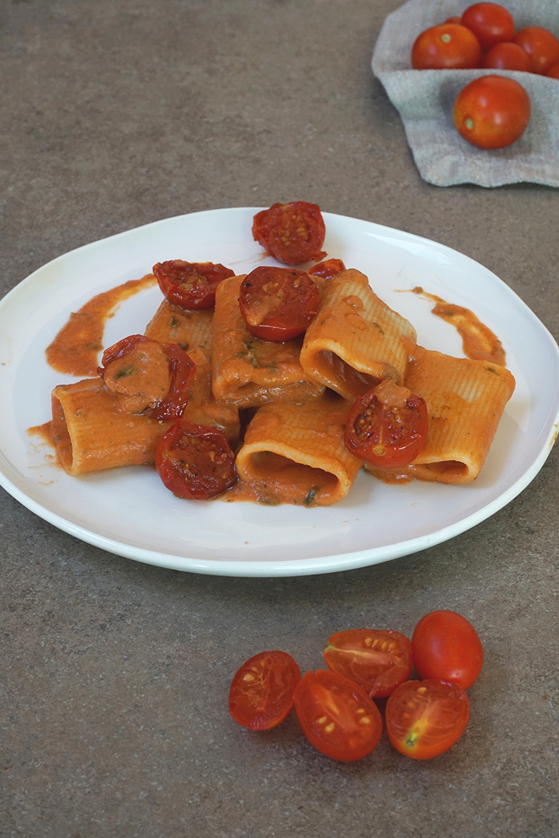 - Cuoci i paccheri, saltali in padella con la crema e servi con i pomodorini caramellati.