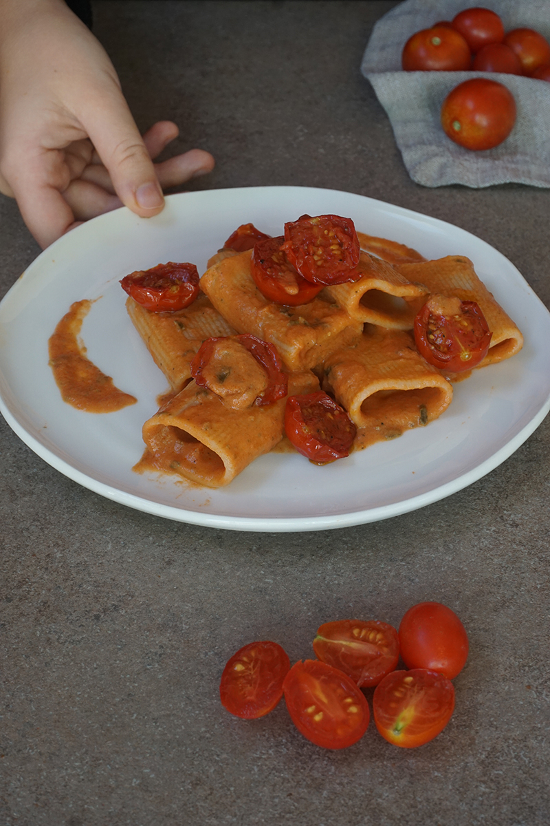 L’ingrediente segreto per aggiungere il sapore di mare a questo piatto è l’alga nori. La Nori è sicuramente l’alga più famosa che esista, grazie al suo utilizzo nella preparazione del sushi; inoltre è ricca di minerali, vitamine e proteine. In questa ricetta l’ho utilizzata per creare una crema al sapore di “pesce”, che viene unita alla delicatezza della panna vegetale e semplicità del sugo di pomodoro. L’ultimo tocco per dare ancora più intensità al piatto è l’aggiunta dei pomodorini caramellati, che creano il giusto contrasto per un mix di sapori irresistibile.