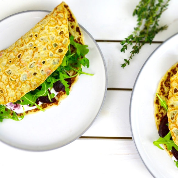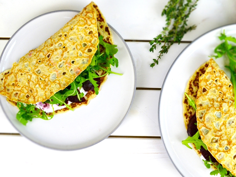 - In una padella, scalda un filo d’olio e cuoci i pancake, per qualche minuto per lato o fino a doratura. Poi, farciscili con formaggio, barbabietole a fette e rucola. Infine, servi.