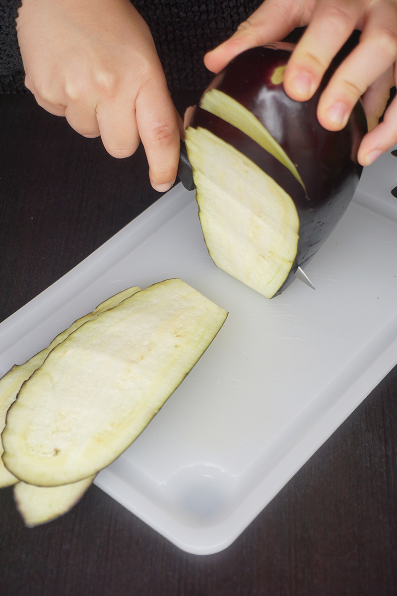 Per eliminare l’amaro delle melanzane, prima di cuocerle ponile a fette in uno scolapasta e salale, poi coprile con un peso (per esempio una pentola) così da comprimerle. Lasciale riposare per almeno 1 ora, in modo tale che perdano liquidi e di conseguenza il loro sapore amaro. Quando saranno pronte, dovrai lavarle sotto acqua corrente e asciugarle con carta da cucina.