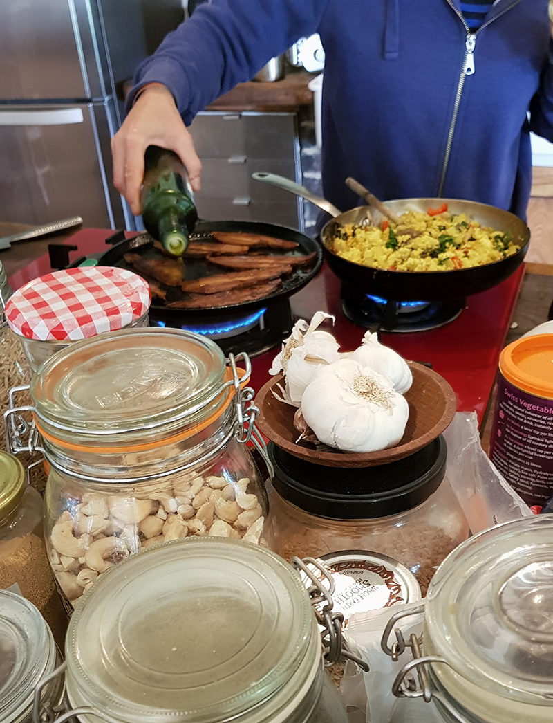 Nella casa c’è una cucina condivisa, dove non sono ammessi carne, pesce e derivati animali. La colazione è compresa nel prezzo delle stanze, se ci si accontenta di una tazza di cereali, frutta, pane, marmellata e cose simili. Se si preferisce una colazione calda, la si può richiedere al prezzo di £5 e si può prenotare anche la cena per soli £8, da condividere con gli altri membri della casa e sempre totalmente vegan.
