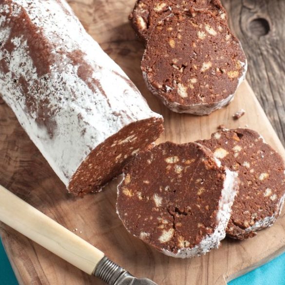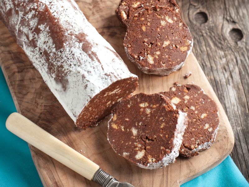 Puoi passarre lo zucchero a velo sulla superficie del salame al cioccolato.
