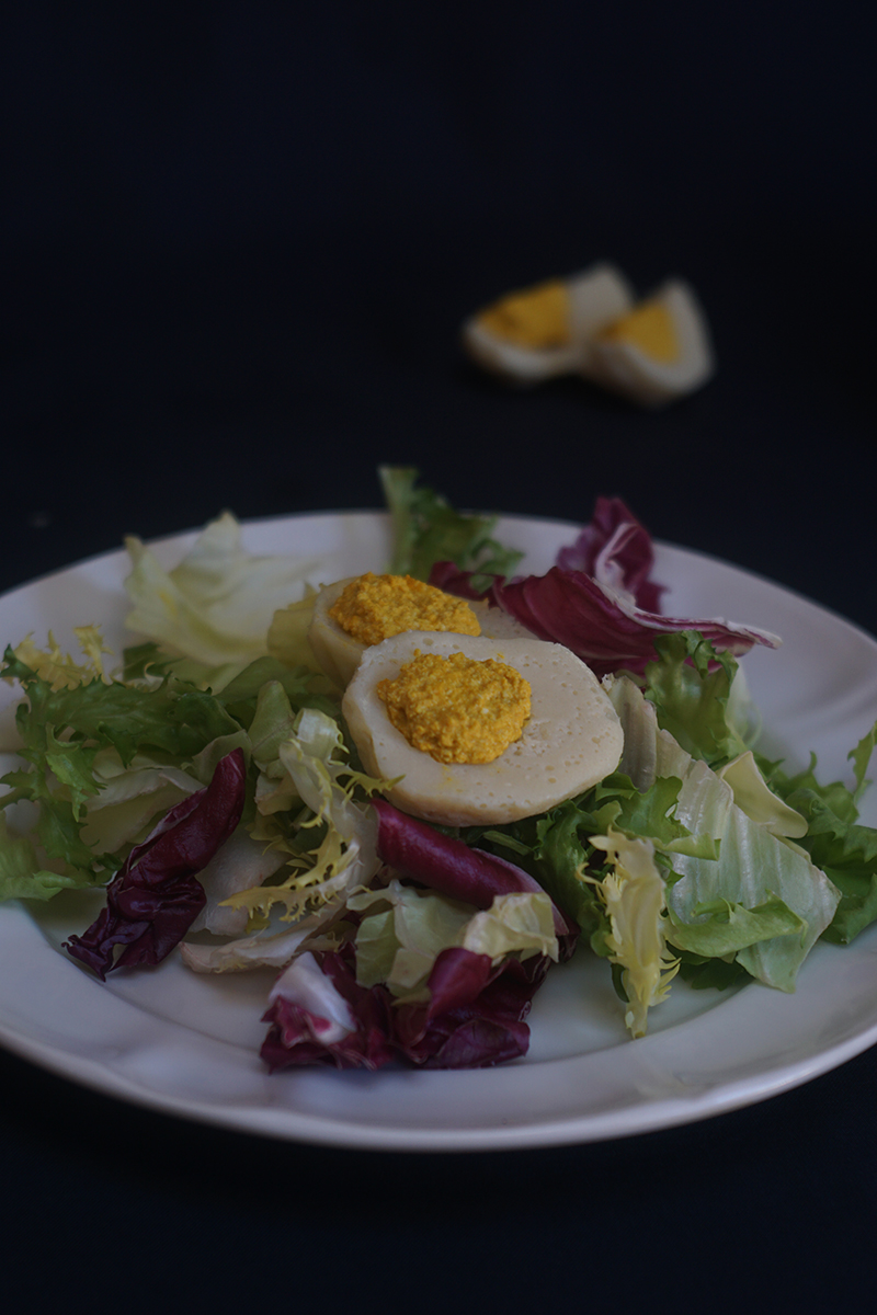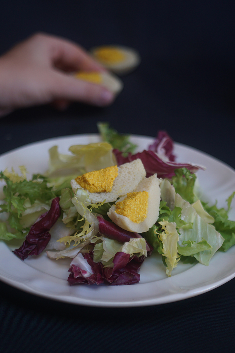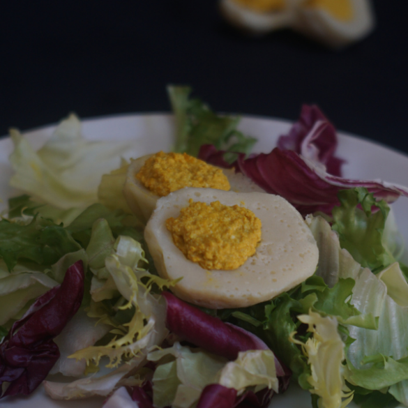 - Inserisci nelle cavità ricavata la crema, cercando di ottenere una piccola pallina che imiterà il tuorlo. In questo modo, otterremo un simil-uovo bollito da poter utilizzare nelle nostre insalate e decorazioni alimentari.
