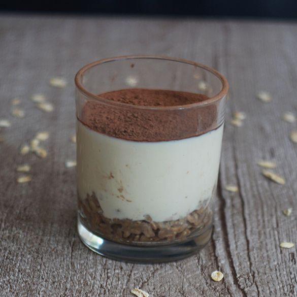 - In un bicchiere disponi uno strato di porridge e uno di crema, alternandoli a piacere. Fai riposare in frigo per almeno 2 ore e servi con una spolverata di cacao amaro in superficie.