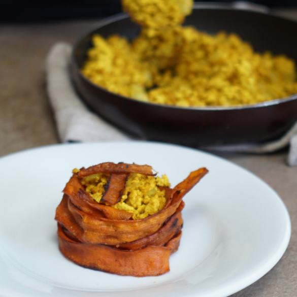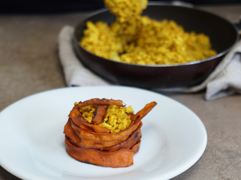 - Con un coppapasta forma uno scrigno di bacon di carote. Aggiungi al centro il tofu strapazzato e servi.