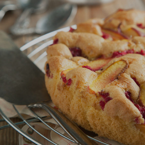 - Versa l’impasto in una teglia per dolci, foderata con carta da forno, e decora la superficie con degli spicchi di pesca, poi cuoci in forno preriscaldato a 180° per circa 30 minuti o fino a quando sarà perfettamente cotta.