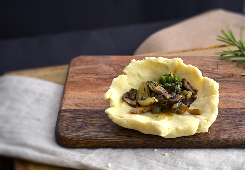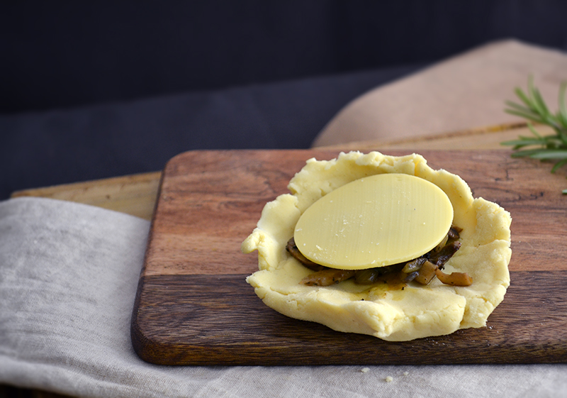 - Dividi l’impasto di patate in circa 10 palline, appiattisci ciascuna pallina e farciscine il centro con un po’ di funghi e piselli e con ½ fetta circa di formaggio. Richiudi l’impasto sulla farcitura (se necessario aggiungi altro impasto) e appiattisci i tortini da entrambi i lati, in modo tale da ottenere dei dischetti ripieni.