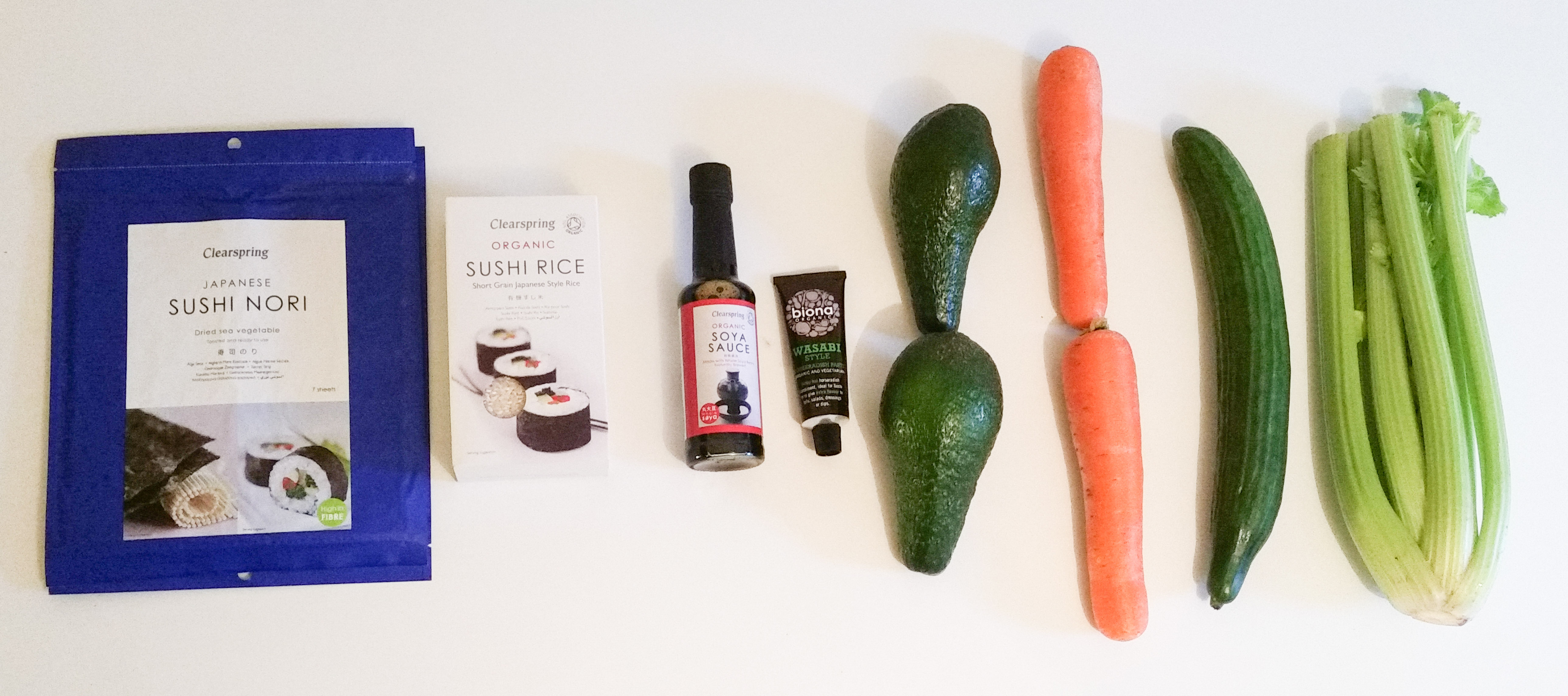 Ciao, questi sono gli ingredienti che ho utilizzato per fare il sushi: riso, alghe nori, vegetali, soya e wasabi per la salsina.