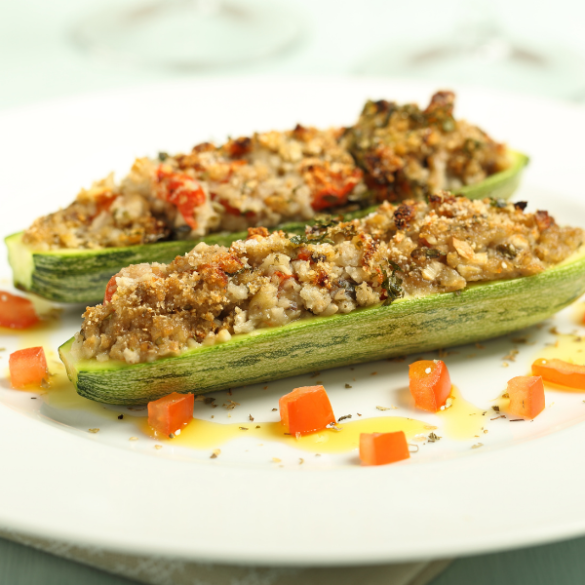 - Riempi le zucchine svuotate con quelle cotte in padella, aggiungi sulla superficie il mix di pane raffermo e noci e cuoci in forno preriscaldato a 180° per circa 10 minuti con l’opzione grill. Infine servi!