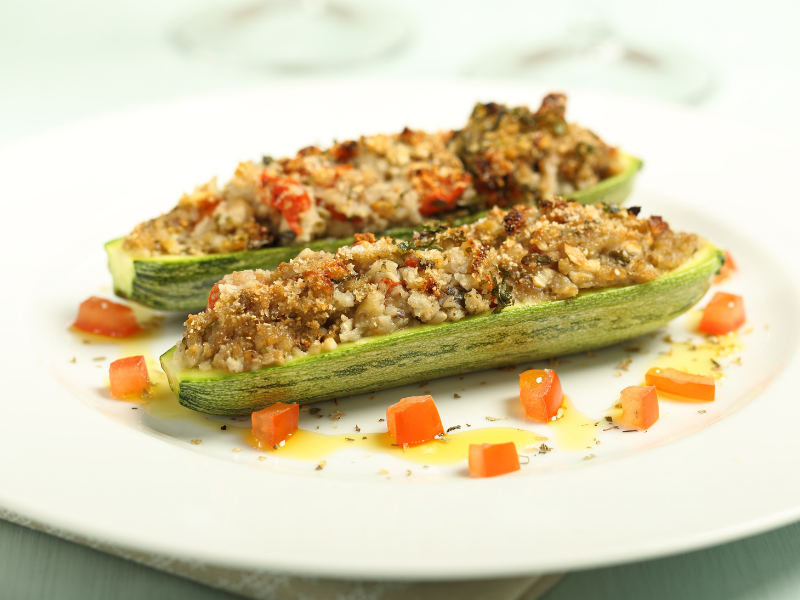 - Dividi a metà 3 zucchine e svuotale con l’aiuto di un cucchiaio. Bucherellale con un coltello, aggiungi una spolverata di aglio in polvere, spennellale con dell’olio evo e cuocile in forno preriscaldato a 180° per circa 15 minuti.